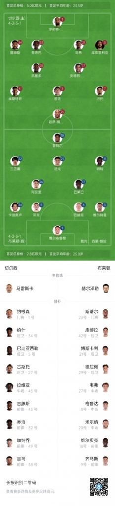 切尔西首发:1-桑切斯、24-詹姆斯、23-查洛巴、21-哈托、3-库库雷利亚、17-桑托斯、25-凯塞多、8-恩佐、41-埃斯特旺、7-内托、20-若昂-佩德罗